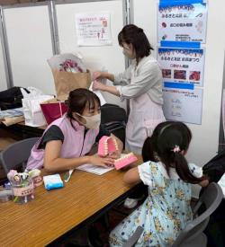 顎模型や歯ブラシ、補助清掃用具などを用いて、歯みがき指導を来場者の方々へ行いました。