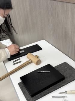 大臼歯型のキーホルダーやコードクリップにイニシャルを入れたり、余った革を自由にカットしてさらにキーホルダーを作るなど、時間が過ぎるのも忘れて楽しく過ごすことができました。